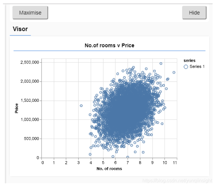 async function run() {// Load and plot the original input data that we are going to train on.const data = await getData();const values = data.map(d => ({x: d.rooms,y: d.price,}));tfvis.render.scatterplot({name: 'No.of rooms v Price'},{values}, {xLabel: 'No. of rooms',yLabel: 'Price',height: 300});// More code will be added below