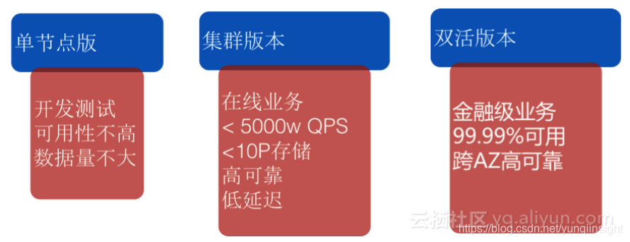首先是针对企业不同的使用环境,不同的SLA诉求,云HBase一共提供3个版本,分别满足开发环境,在线业务,以及金融级业务的诉求。单节点版本,低廉的价格用于开发测试场景,集群版本,99.9%可用,满足企业在线业务诉求,支持最高5000万的QPS和10P的数据。还有支持金融级高可用的双活版本。所有版本都支持11个9的数据可靠性,无需担心数据丢失。