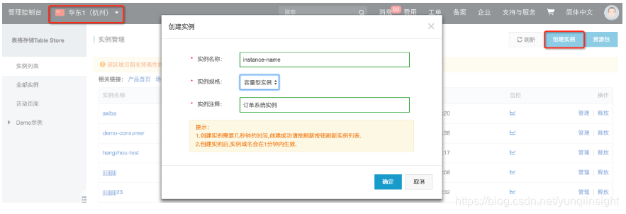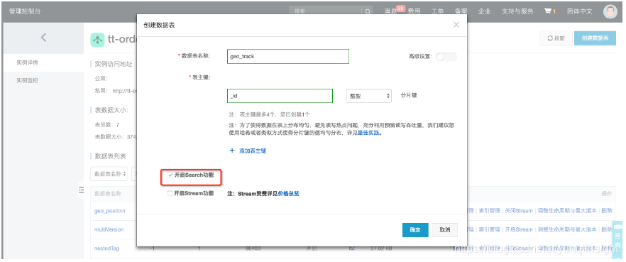 通过控制台创建表格存储实例,选择支持多元索引的Region。(当前阶段SearchIndex功能尚未商业化,暂时开放北京,上海,杭州和深圳四地,其余地区将逐渐开放)
