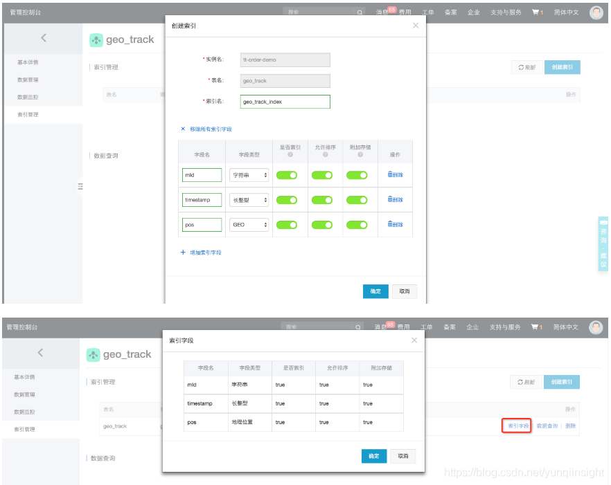 用户仅需在完成邀测的实例下创建“摩托车轨迹表”:通过控制台创建、管理数据表(用户也可以通过SDK直接创建):其他表如租赁用户表、摩托车信息表等,根据需求创建:这里仅展示轨迹表,表名:geo_track