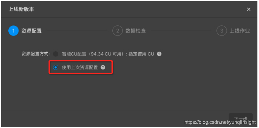 重新上线作业。选择智能推荐配置,指定使用CU数为系统默认,不填即可。点击下一步。