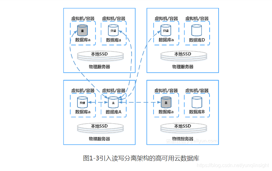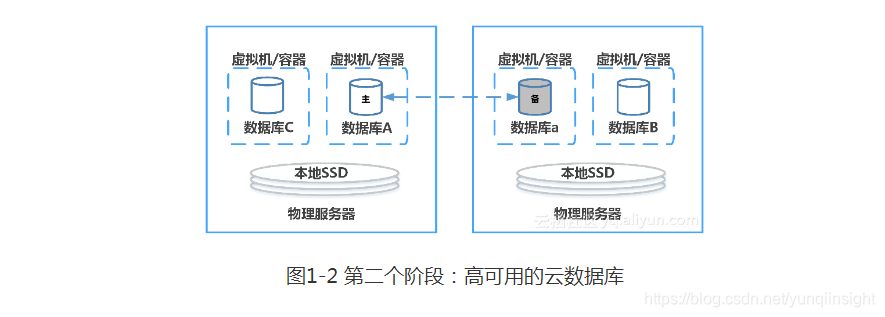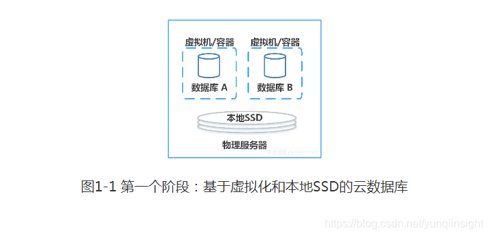 云计算的高速发展是和互联网密不可分的。云计算服务最早孵化的契机是互联网电商巨头为了能够充分利用大量被闲置的IT服务器这样的一个背景产生的。一开始为互联网开发者和创业型公司服务,提供易用、迅捷的、高性价比的IT资源服务。把数据库放在云上,首先需要解决多租户共享使用资源的问题,如图1-1所示。通过把物理服务器的CPU、内存、本地存储、网络资源通过虚拟机或容器进行资源和性能的切分和隔离,就能运行多个数据库实例,为多个云用户提供服务。当然,为了减少多个数据库之间I/O性能的串扰,高速的SSD存储也成为了标配。这是最早期云数据库形态,特点是成本最优,至今还在为一些首要关注成本的开发者和小客户所使用。