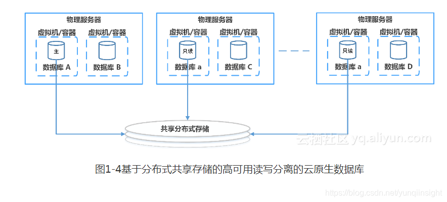 而图1-4 是云数据库演化的质的飞跃,基于共享存储的高可用读写分离架构,这种架构利用分布式共享存储,采用数据三副本存储,提高了数据的可靠性。使用数据共享架构,只读节点各自无需进行数据的复制,极大的提升了系统性能,而且支持多达15个只读节点,还能保证更低的只读节点的数据延迟。当只有一个只读节点时,只读节点在获得读写分离能力的同时,还能额外提供一倍的读性能,这种Active-Active的高可用机制,相对于之前的Active-Standby的高可用机制,是一个技术演化的进步。总之,基于共享分布式存储会带来本质上的技术架构优势,阿里云的云原生数据库POLARDB,就是基于这样一种最新的技术架构演化发展而来,按照28法则并结合实际运维经验来看,能够满足80%以上用户的关系型数据的处理场景。