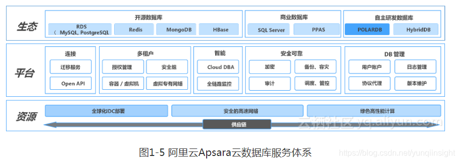 从上诉云数据库的演化过程来看,云数据库拓展了企业级整体方案的服务能力(高可靠、高可用、负载均衡、读写分离等等),并且在云平台的能力基础上,通过技术架构的演化形成云原生数据库,提供了传统数据库能力的超集,形成了如图1-5 的从资源、平台到生态的整体云服务体系,对比传统数据库具有以下特点: