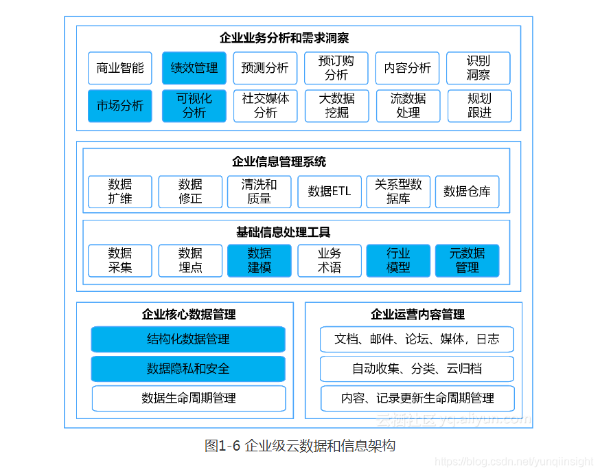 对于现代化企业来讲,需要在企业云计算数据中快速发掘新的价值和机会,云服务提供的IT资源能力,已经是整体数字化方案的最佳实践。未来企业生产力的竞争,不再仅仅比拼横向生产的规模,运营的效率,和获取资源的能力。更需要在纵向上,在应对用户需求的市场快速变化上,提供更加精益的生产力和精准的营销能力。数字化时代企业需要具有快速应变的创新能力,通过数据进行关联和分析,快速、直接、精准的感知需求和洞悉市场的变化,能够打造个性化、精细化、新颖化的产品和服务,给企业带来新的生命力。企业云计算数字化IT架构逐渐成为标配,云服务已经不是最早期的满足中小互联网用户的形态和能力,云原生关系型数据库能够围绕企业级云应用关注的业务连续性、高性能处理能力、安全可靠性、可扩展性、弹性能力等提供整体方案和服务能力。如下图1-6所示,企业级云应用围绕数据管理的多个维度以及业务、信息和数据管理的流程,对于数据处理,交易过程,分析萃取,工作流等最后沉淀下来的是最为宝贵的,能够直接表述用户信息、需求信息、业务性能和商业价值的多个模块,都和关系型云数据库紧密关联。