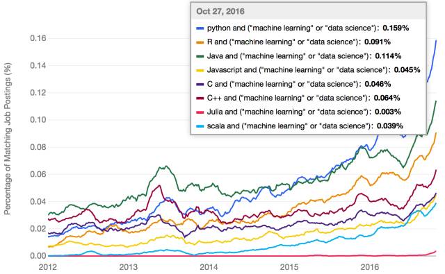 话不多说,上数据。我搜索关键词“机器学习”和“数据科学”一,搜索选项包括编程语言Java、C、C+++、JavaScript,还包括了Python和R,因为我知道它在机器学习和数据科学方面很受欢迎,当然还有Scala,考虑到它与Spark的关系,再加上Julia,一些开发者认为这是编程界的“the next big thing”。运行这个查询,我们得到的数据如下: