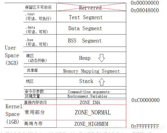 虚拟地址内存划分比例为3:1,用户空间占3G,内核空间占1G。此图的地址从上到下依次增大。最上面128M为保留区,不可访问。接下来是.text段存放的是指令,.data段存放的是初始化但不为0的全局变量和静态全局变量,.bss段存放的是未初始化的或者初始化为0的全局变量和静态全局变量。heap(堆)从低地址向高地址增长,用户手动开辟的内存就是在堆区,释放也需要用户手动释放。stack(栈)从低地址向高地址增长,主要存储局部变量等这块内存是系统开辟和释放的。堆和栈中间是共享库,命令行参数存储程序名和参数。环境变量是指系统运行一个程序,但没有告诉它程序所在的路径时,系统除了 在当前目录下面寻找此程序外,还会到path中指定的路径去找,我们可以通过设置环境变量,来更好的运行进程。ZONE_DMA :(直接内存访问)可以加快磁盘和内存之间的数据交换,不需要经过CPU的寄存器,提高了CPU的工作效率。ZONE_NORMAL是内核中最重要最常用的部分,用于直接映射,PCB(进程控制块)就在这里。ZONE_HIGHMEM是高端内存,用于在内核中映射高于1GB的物理内存时使用,64位操作系统没有该段。