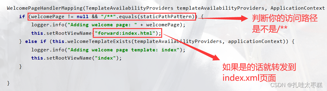 public WelcomePageHandlerMapping welcomePageHandlerMapping(ApplicationContext applicationContext, FormattingConversionService mvcConversionService, ResourceUrlProvider mvcResourceUrlProvider) {// 下面 welcomePageHandlerMapping 的有参函数在下面图片WelcomePageHandlerMapping welcomePageHandlerMapping = new WelcomePageHandlerMapping(new TemplateAvailabilityProviders(applicationContext), applicationContext, this.getWelcomePage(), this.mvcProperties.getStaticPathPattern());welcomePageHandlerMapping.setInterceptors(this.getInterceptors(mvcConversionService, mvcResourceUrlProvider));welcomePageHandlerMapping.setCorsConfigurations(this.getCorsConfigurations());return welcomePageHandlerMapping;