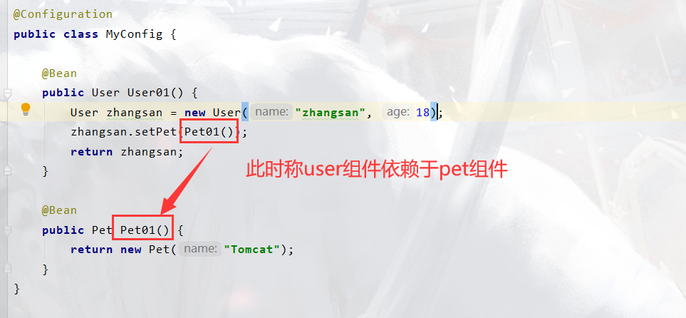 @Bean:向容器注册注解下面方法返回值对应的对象,相当于bean标签。@Bean注解还可以使用参数给对象命名,相当于bean标签中的id属性。默认命名为注解下面的方法名🚩获取指定的组件