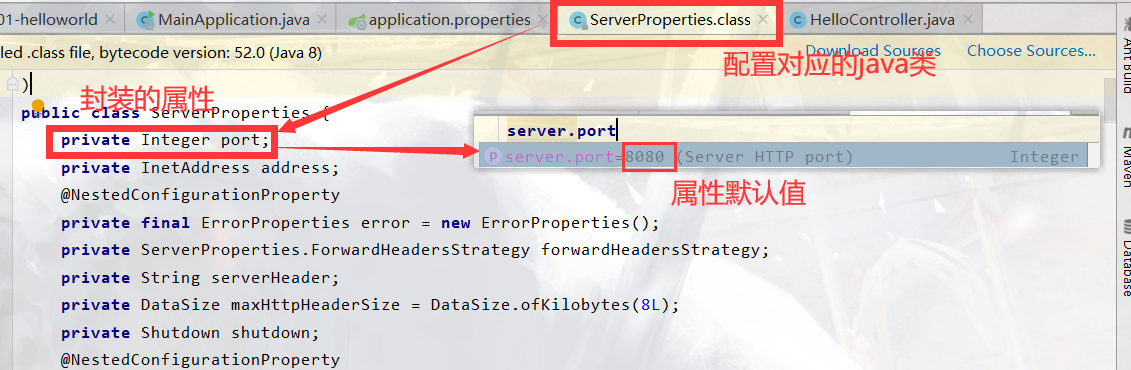 SpringBoot为了简便开发,将Spring配置文件中的所有配置都设置了一个默认的值,而这些配置都映射到一个java类,类中将所有的配置都对应封装到一个private属性并赋予默认值,在容器加载的时候创建相应java类的对象使其起作用。自己创建的配置文件设置值时,会调用封装属性的setter方法修改对应类中的属性值。