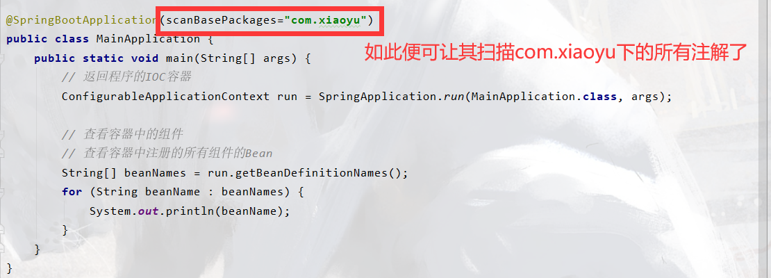 主程序(MainApplication)所在的包及这个包的所有子包都会被扫描到,其他位置的类都将不会被扫描到。这是SpringBoot设置的默认规则,我们也可以使用如下属性人为指定包注解扫描的范围。