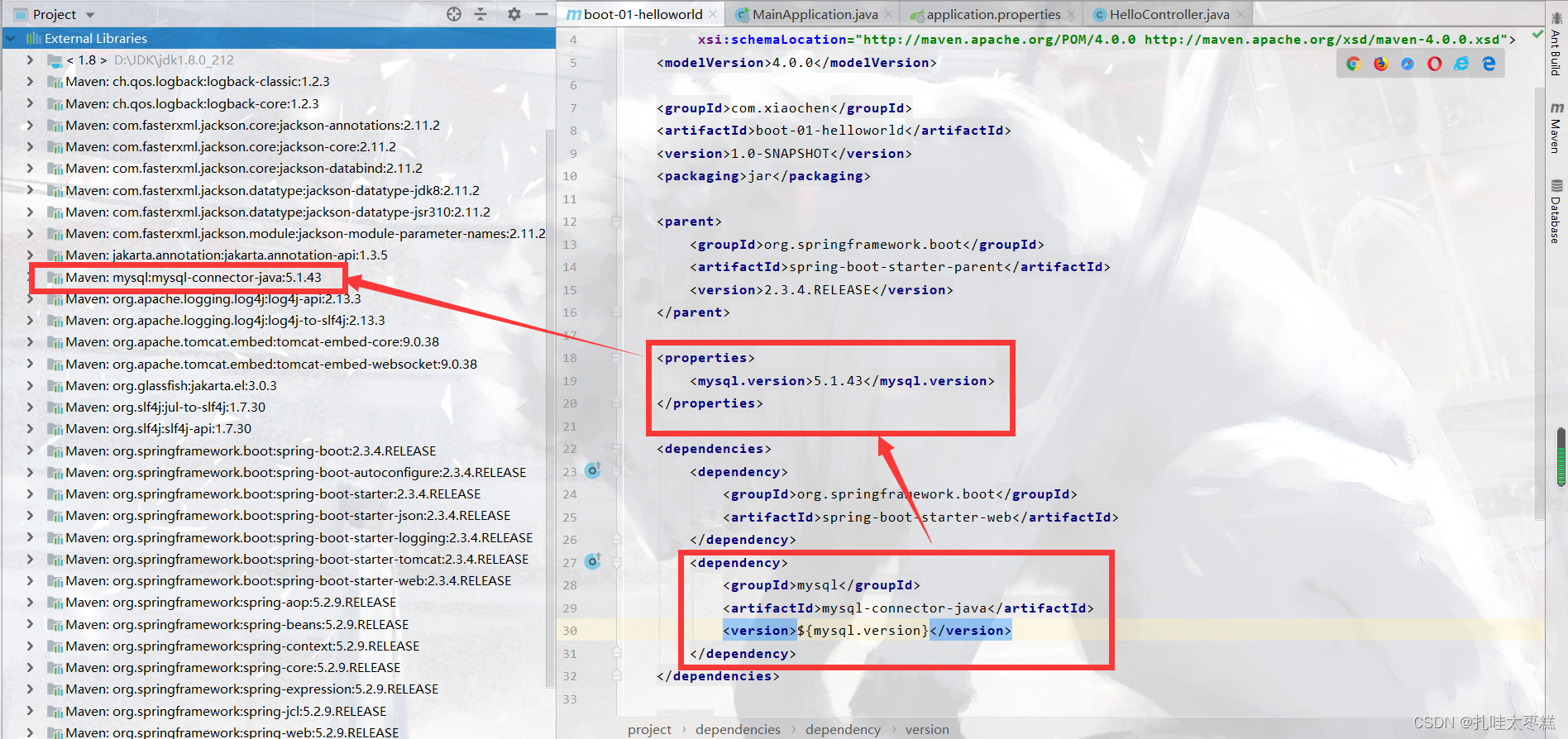 <parent><groupId>org.springframework.boot</groupId><artifactId>spring-boot-starter-parent</artifactId><version>2.3.4.RELEASE</version> </parent>这个父项目项目又继承自另一个父项目,在这个父项目中几乎定义了所有可能会用的到的依赖,并对所有的进行了版本仲裁,如果想要修改某个依赖版本的话就在pom.xml文件中使用properties标签对版本号进行再次定义,因为maven依赖版本号采取的是就近原则。