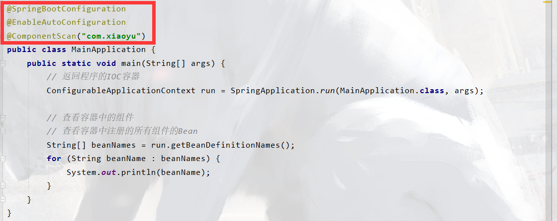 其中@SpringBootApplication是一个合成注解,还可以将其拆开使用其中的@ComponentScan注解指定需要扫描的包