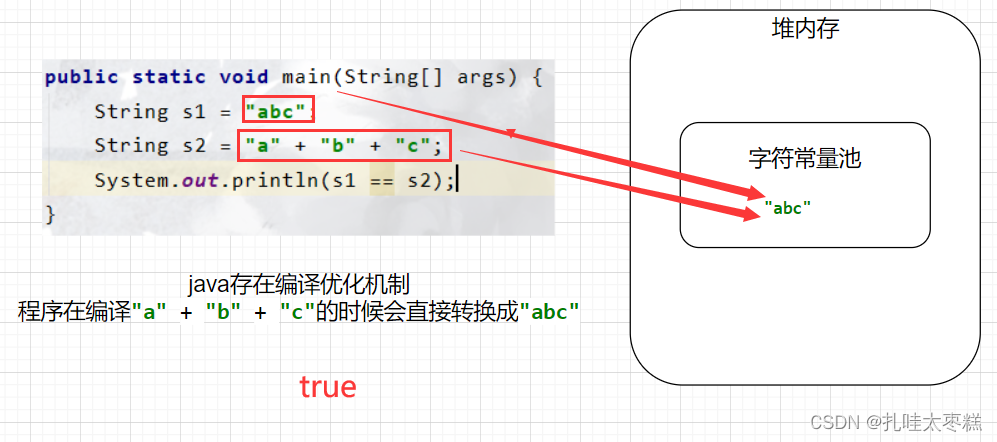 ⚠ 两种方式的区别:第一种方式产生的字符串对象会在字符串常量池中存储,且相同的内容只会在其中存储一份。第二种方式产生的字符串对象会放在堆内存中,创建几次就有几个字符串对象。