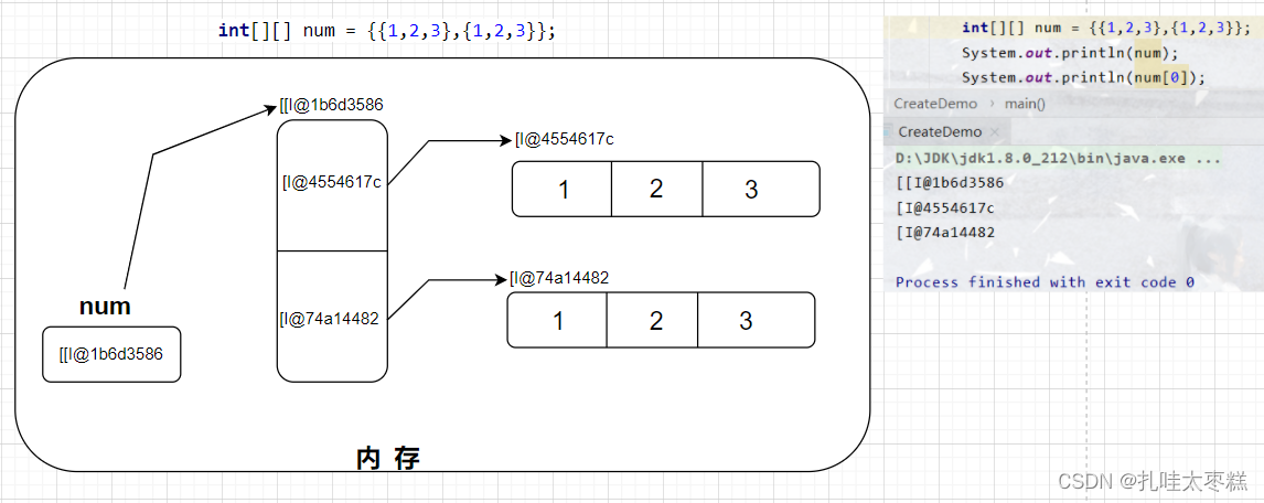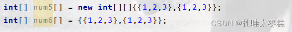 如果定义语句为int[ ][ ] num = new int[3][2];的话,num[行索引][列索引]的输出为0,num[行索引]的输出是相应的地址值;