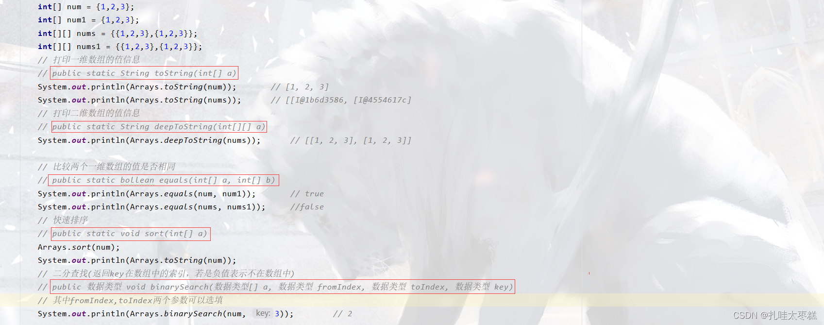 ⚠ 数组定义完成之后,在未进行赋值之前所有的元素会按照数据类型默认初始化为相应的值,整型:byte、short、int、long会初始化为0;字符型:char也初始化为0,只不过是0的字符形式计算机表示出来会乱码;浮点型:float、double会初始化为0.0;布尔型:boolean会初始化为false;其他引用数据类型:String、类、接口、数组……会初始化为null