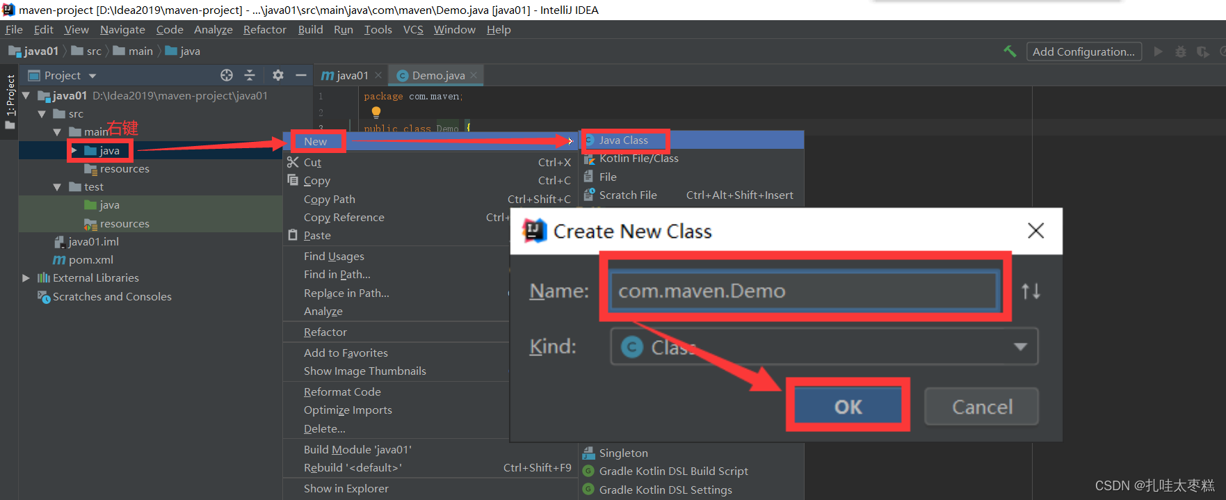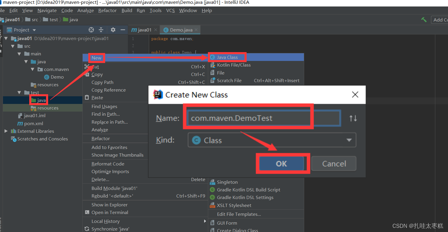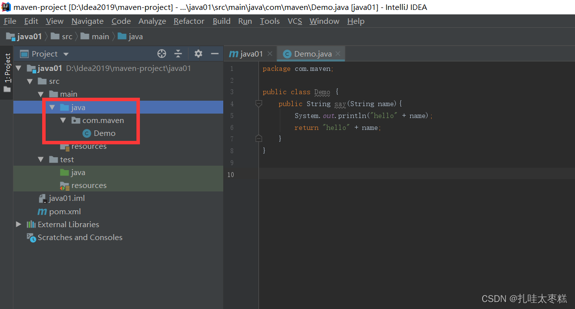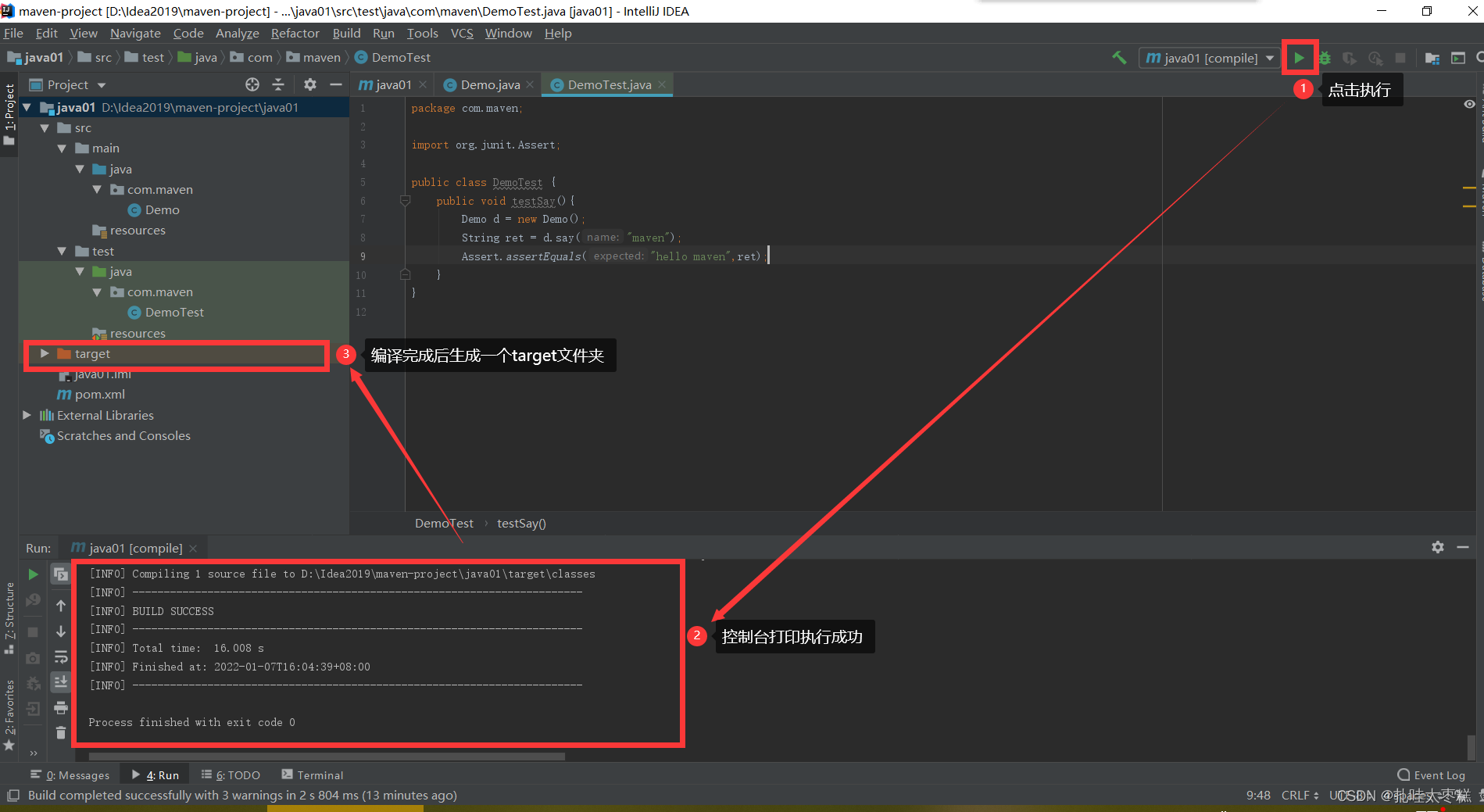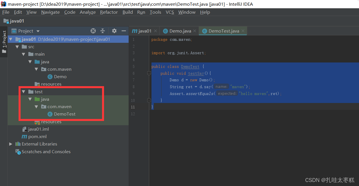 public class DemoTest {public void testSay(){Demo d = new Demo();String ret = d.say("maven");Assert.assertEquals("hello maven",ret);}