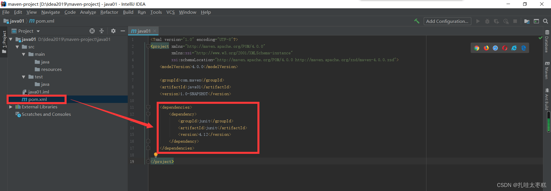 <dependencies><dependency><groupId>junit</groupId><artifactId>junit</artifactId><version>4.12</version></dependency>