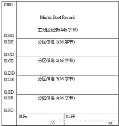 | 主引导扇区位于硬盘的0磁道0柱面1扇区,共512bytes,可存放一小段程序及主分区表,由三大部分组成: 硬盘主引导记录MBR(Master Boot Record)占446bytes 分区表DPT(Disk Partition Table)占64bytes 硬盘有效标志(Magic Number)占2bytes。 硬盘有效标志为AA和55,它们被称为幻数(Magic Number),BOIS读取MBR的时候总是检查最后是不是有这两个幻数,如果没有就被认为是一个没有被分区的硬盘主引导扇区包含的MBR、DPT、MN,这3个区域是操作系统无关的,在每块硬盘上都存在;MBR是一段可执行程序,由各个操作系统写入不同的代码。 MBR的存储空间限制为446字节,MBR所做的唯一的事情就是装载第二引导装载程序。Windows产生的MBR装载运行PBR;GRUB产生的MBR 装载运行grldr