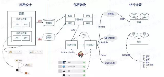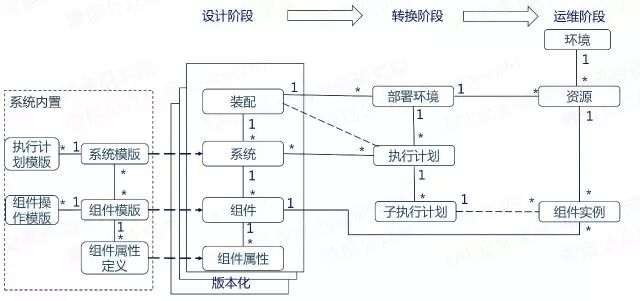除了系统内置的一些模版概念,我们将自动化部署流程分为三个阶段,即设计、转换、运维。每个阶段都会有相应的基本模型。