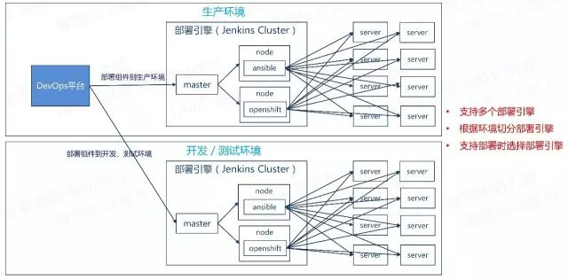 由于我们最终会将应用部署到虚拟机和容器云中,虚拟机部署主要通过jenkins中提供的ansible插件+jenkins pipeline script来实现;容器云部署则根据具体的容器云,通过openshift插件(会有一定扩展)或者http request插件+jenkins pipeline script来实现。