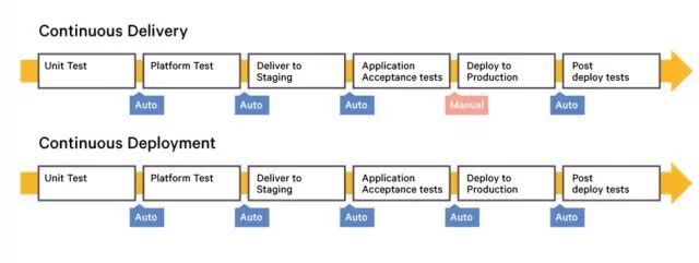 持续交付流程将自动的测试新版本应用,但是否将新版本交付到生产环境中是一个手动过程。持续部署则是自动地将新版本交付到生产环境中去。
