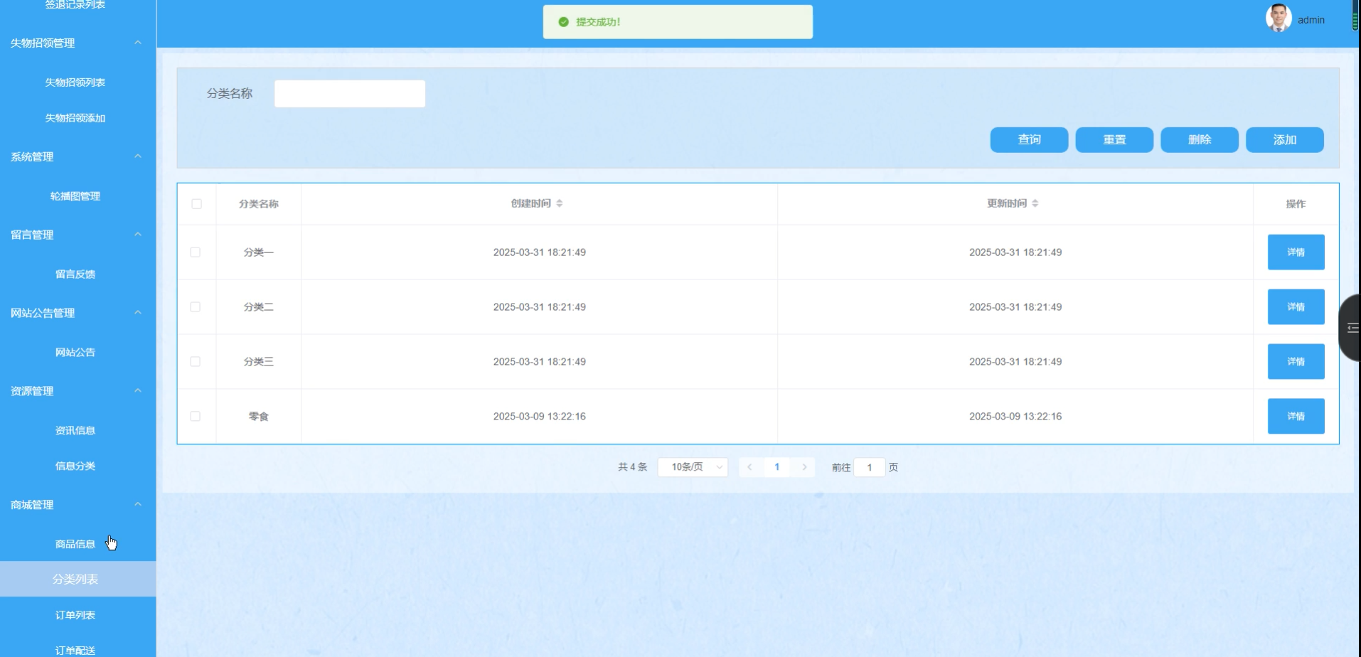 管理员可以根据不同的种类和用途对商品进行分类,方便用户在商品信息中快速查找所需商品。良好的分类管理不仅有助于提升用户体验,还能提高产品的曝光率,促进销售。分类列表如下图所示。