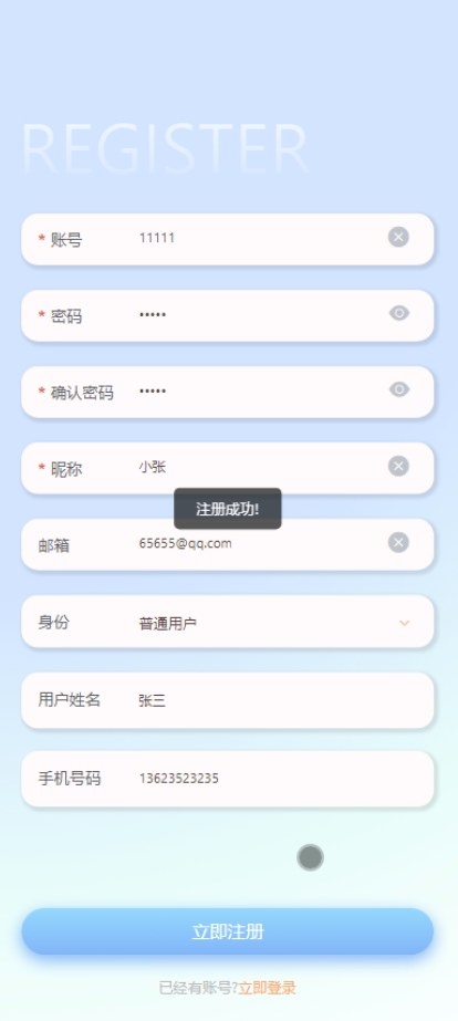 用户注册:输入账号、设置密码、确认密码、昵称、邮箱、选择用户身份、用户姓名、用户性别、联系电话等用户个人信息,点击注册按钮进行注册,用户注册界面如下图所示。
