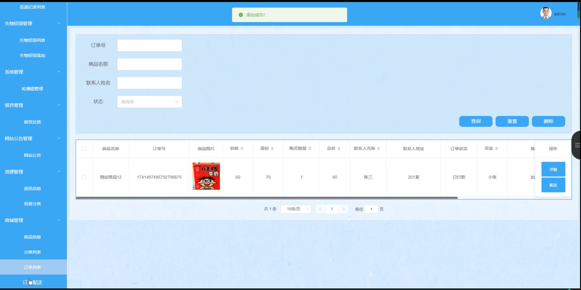 管理员可以查看所有接收到的订单,包括订单的详细信息、状态和用户信息。此功能允许管理员快速处理订单,进行发货、退款和修改等操作,确保交易的顺利进行。订单列表如下图所示。