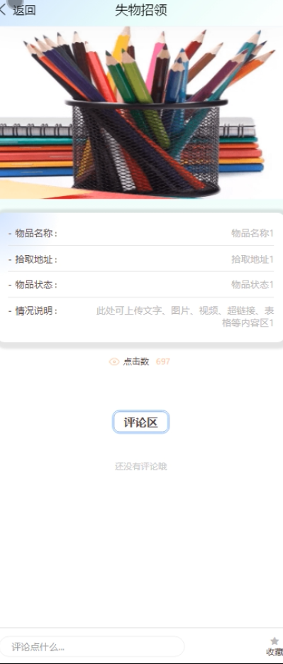 该功能允许用户查看和发布失物招领信息。如果在自习室内遗失物品,用户可以通过此模块发布失物信息,其他用户或管理员则可以帮助寻找遗失物品。主界面图如下所示。