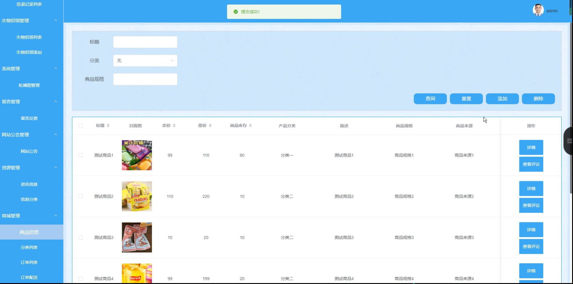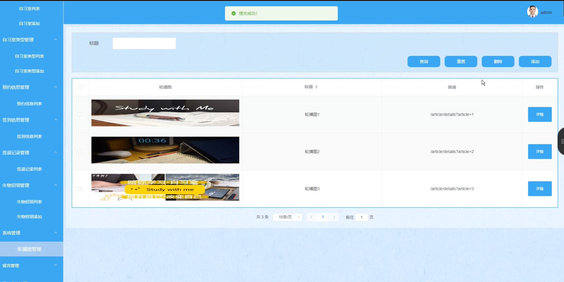 系统管理:可以查看轮播图详情,以及查询、重置、删除、添加等操作。系统管理界面如下图所示。