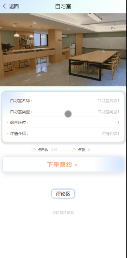 用户可以查看平台上各自习室的详细信息,包括自习室的类型、容量、开放时间、预约情况等。用户可以根据自己的需求选择适合的自习室进行预约。界面如下图所示。