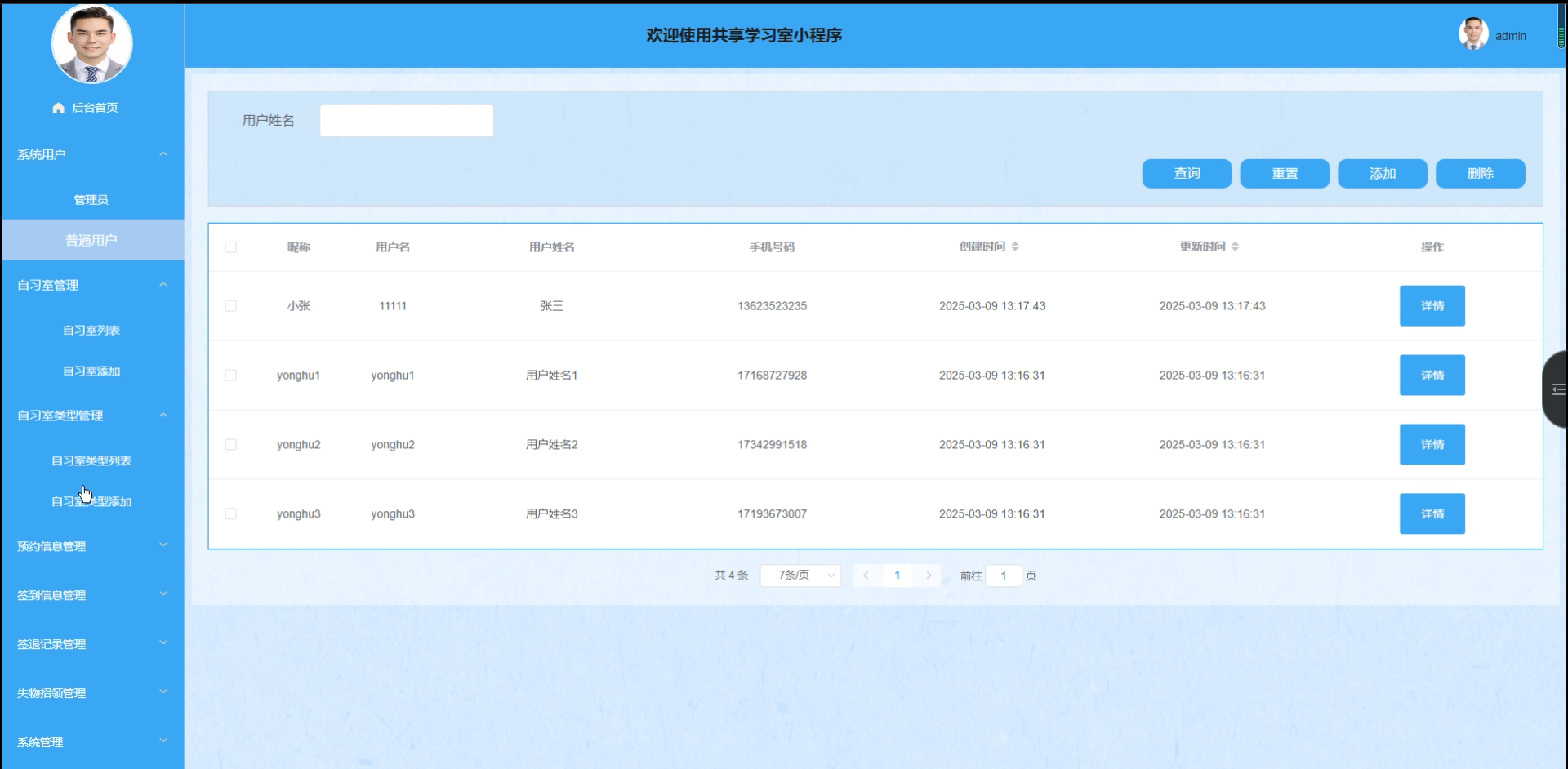 In terms of functional design, the system not only realizes the reservation and management of self-study rooms, but also combines the mall function, allowing users to purchase learning related products, and provides a feedback mechanism for administrators to collect user opinions and suggestions. In addition, the lost and found function effectively solves the problem of lost items in the study room and enhances the user experience. Through the design of these comprehensive functions, the system not only meets the daily learning needs of users, but also enhances the management level of the learning environment.