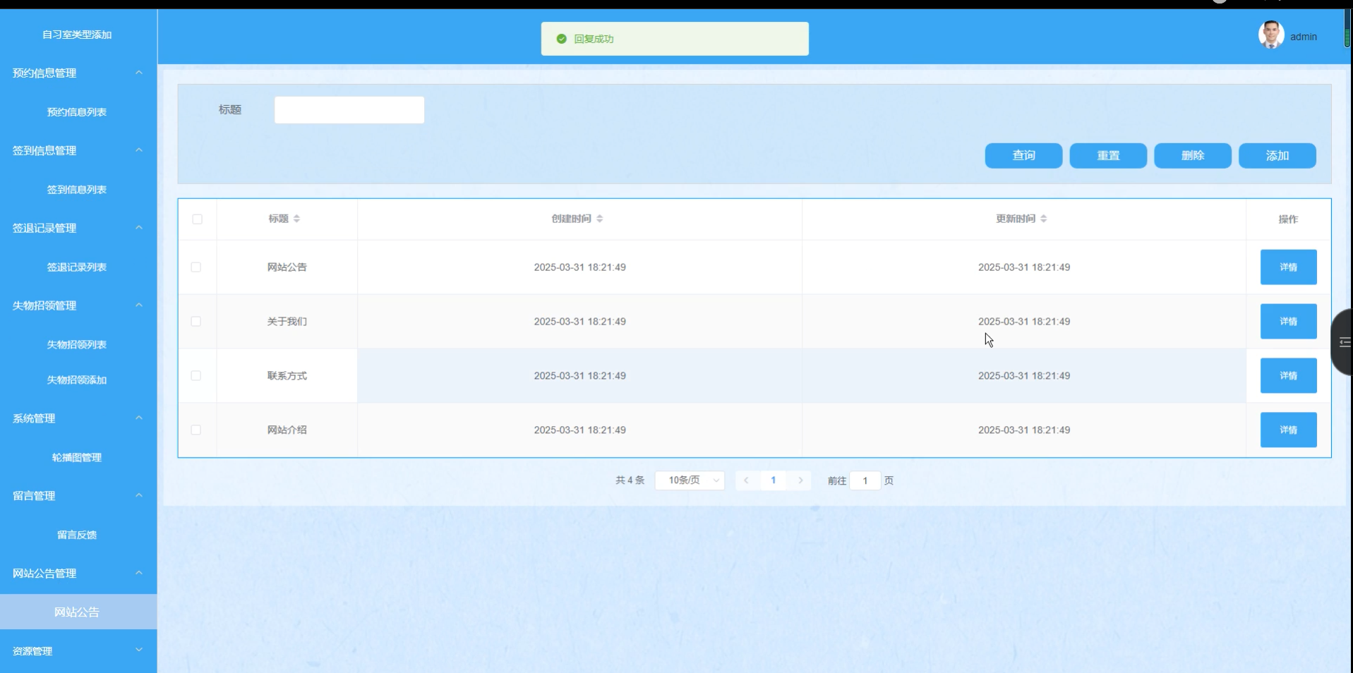 管理员可以发布网站公告,管理员还可以编辑、删除或修改已发布的公告,确保公告内容的时效性和准确性。网站公告管理如下图所示。