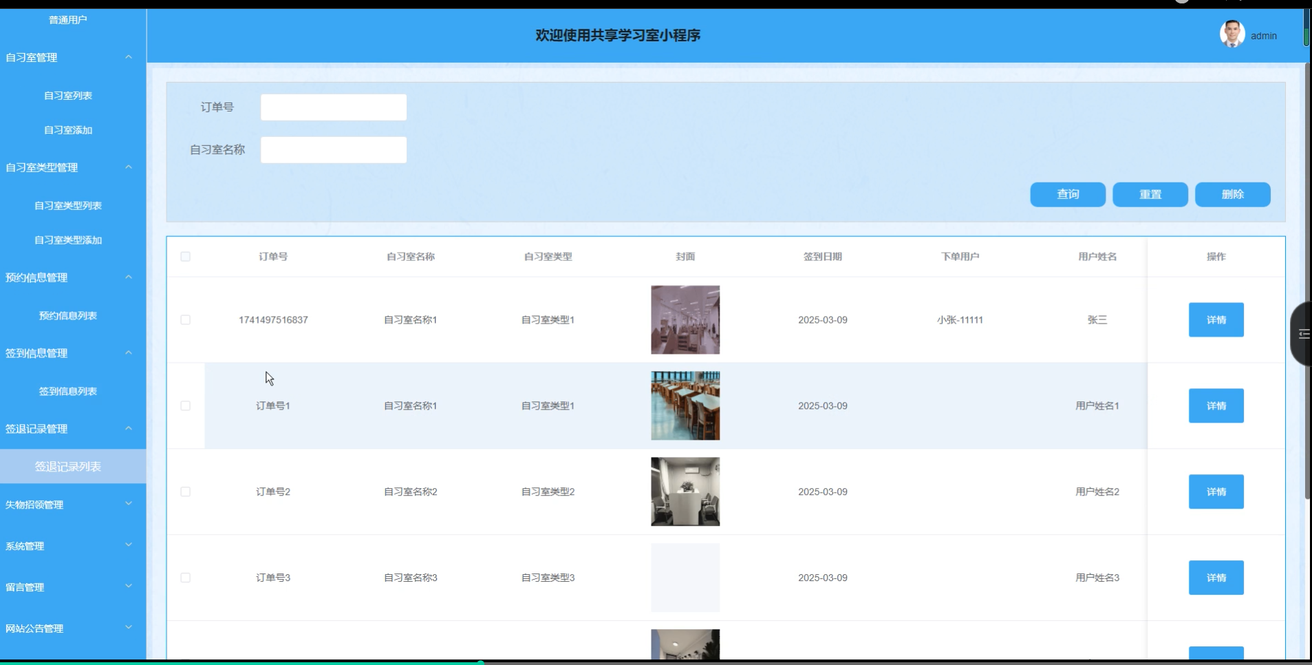 签退记录管理模块用于查看所有用户的签退记录。管理员可以审核并管理用户的签退时间和状态,确保每个用户的自习室使用记录准确无误,同时为管理层提供有价值的数据支持。界面如下图所示。
